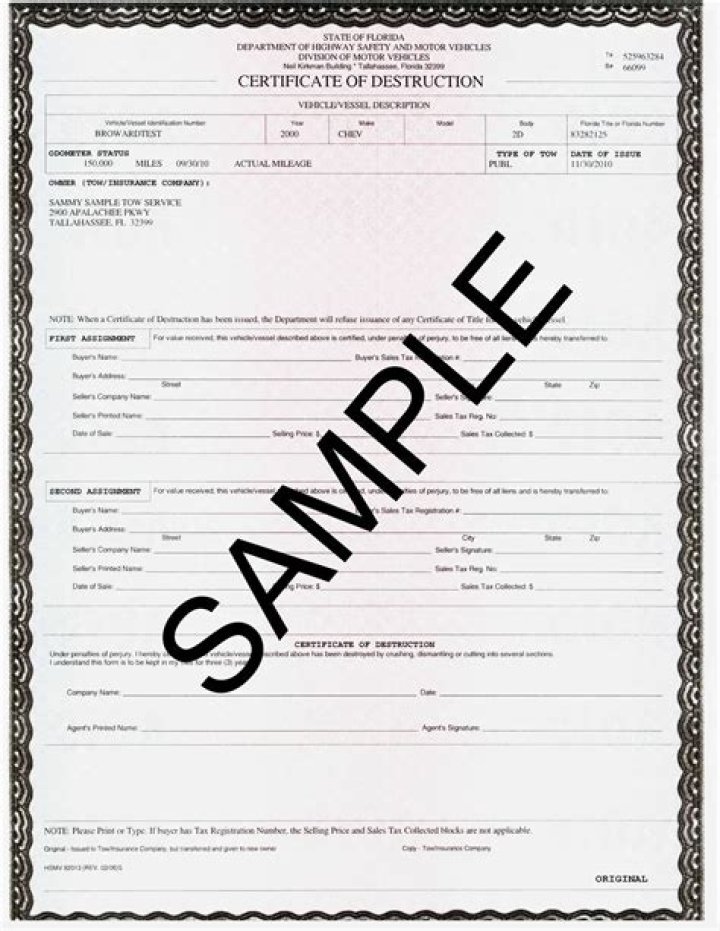 A certificate of destruction is basically a Death Certificate.. That vehicle can never be operated on the road again. If the cost to repair is less than , usually about 70 to 80% of the vehicle value they may request that a salvage title be issued.
