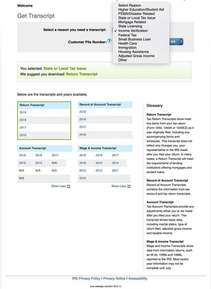 Businesses can get two types of transcripts: a tax return transcript or a tax account transcript. Before requesting a copy of the transcript, the taxpayer should determine which transcript best meets their needs.