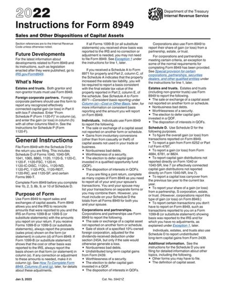 Purpose of Form Use Form 8949 to report sales and exchanges of capital assets. Form 8949 allows you and the IRS to reconcile amounts that were reported to you and the IRS on Forms 1099-B or 1099-S (or substitute statements) with the amounts you report on your return.