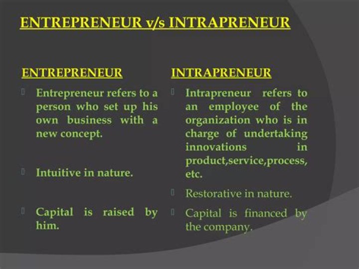 The differences between entrepreneurs and intrapreneurs include an entrepreneur establishes a new business. An intrapreneur is an employee of an organization authorized to undertake innovations in product, service, process, etc. An entrepreneur is intuitive, whereas an intrapreneur is restorative.