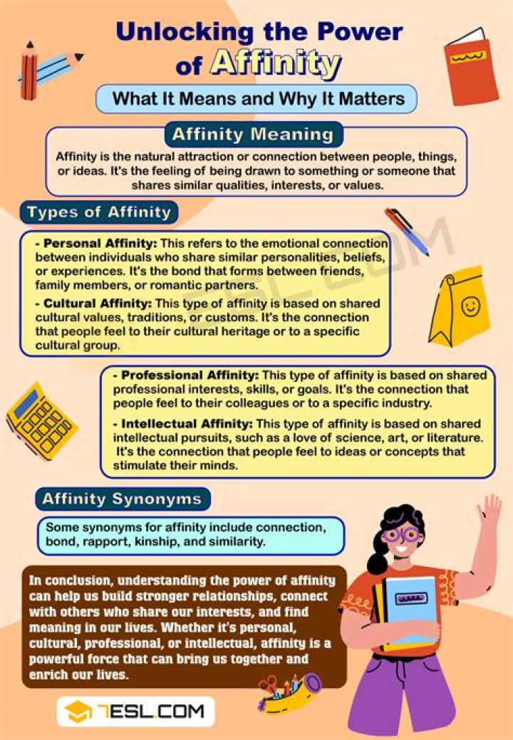 : a strong liking for or attraction to someone or something They had much in common and felt a close affinity. affinity. noun.