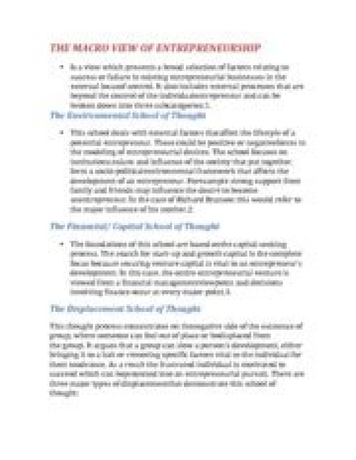 3. Displacement represent a breakdown of the macro view. In the other way, the micro view of entrepreneurship examines the factors that are specific to entrepreneurship and are part of the internal locus of control. The potential entrepreneur has the ability to direct or adjust the outcome of each major influence.