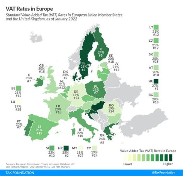 The EU countries with the highest standard VAT rates are Hungary (27 percent), and Croatia, Denmark, and Sweden (all at 25 percent). Luxembourg levies the lowest standard VAT rate at 17 percent, followed by Malta (18 percent), and Cyprus, Germany, and Romania (all at 19 percent).
