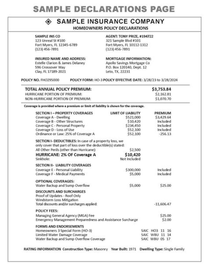 What Is an Insurance Declarations Page? Your insurance declaration page, also known as the dec page, summarizes the information essential to your insurance coverage. It includes your name and address, descriptions of the insured property and your premium.